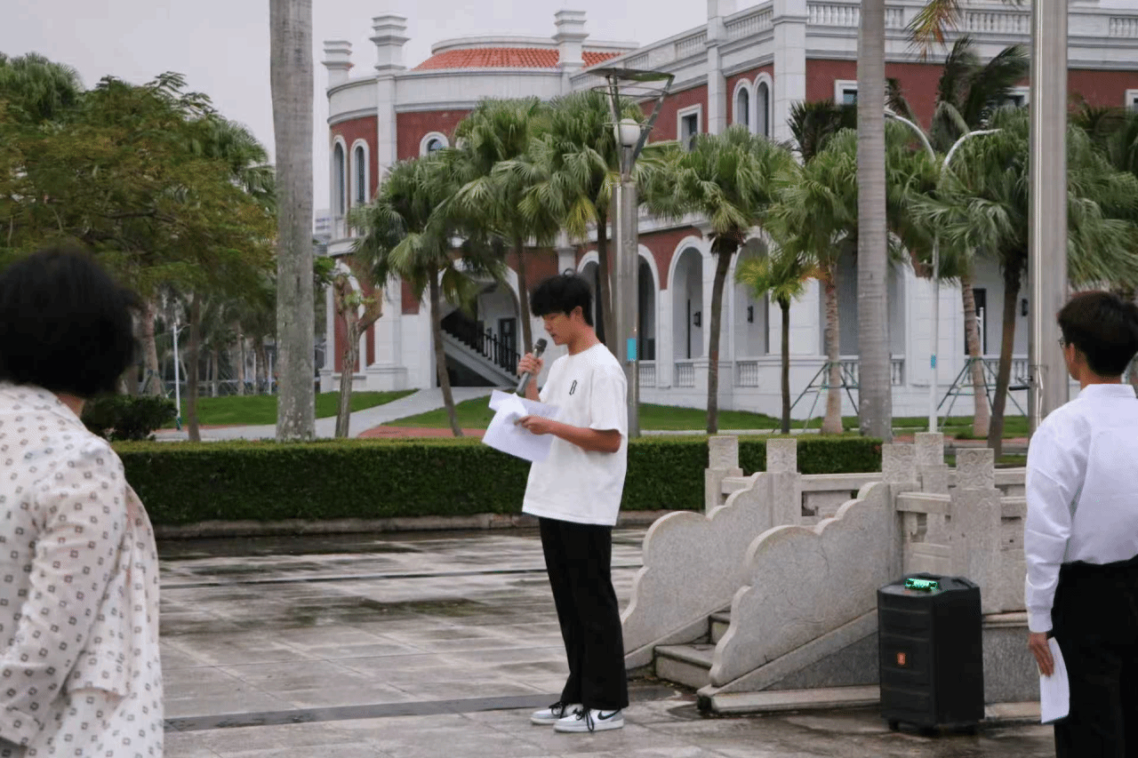 仪式第三项,由学生代表兼升旗仪式主持2025级体育学院休闲体育专业冯浩航同学作为学生代表发表题为《自贸东风起 琼州万象新》的国旗下演讲,他结合自身感悟,号召同学们以 “自贸港一代” 的使命担当,将个人理想融入国家发展大局,勤学笃行、敢为人先,为自贸港建设注入青春动能。